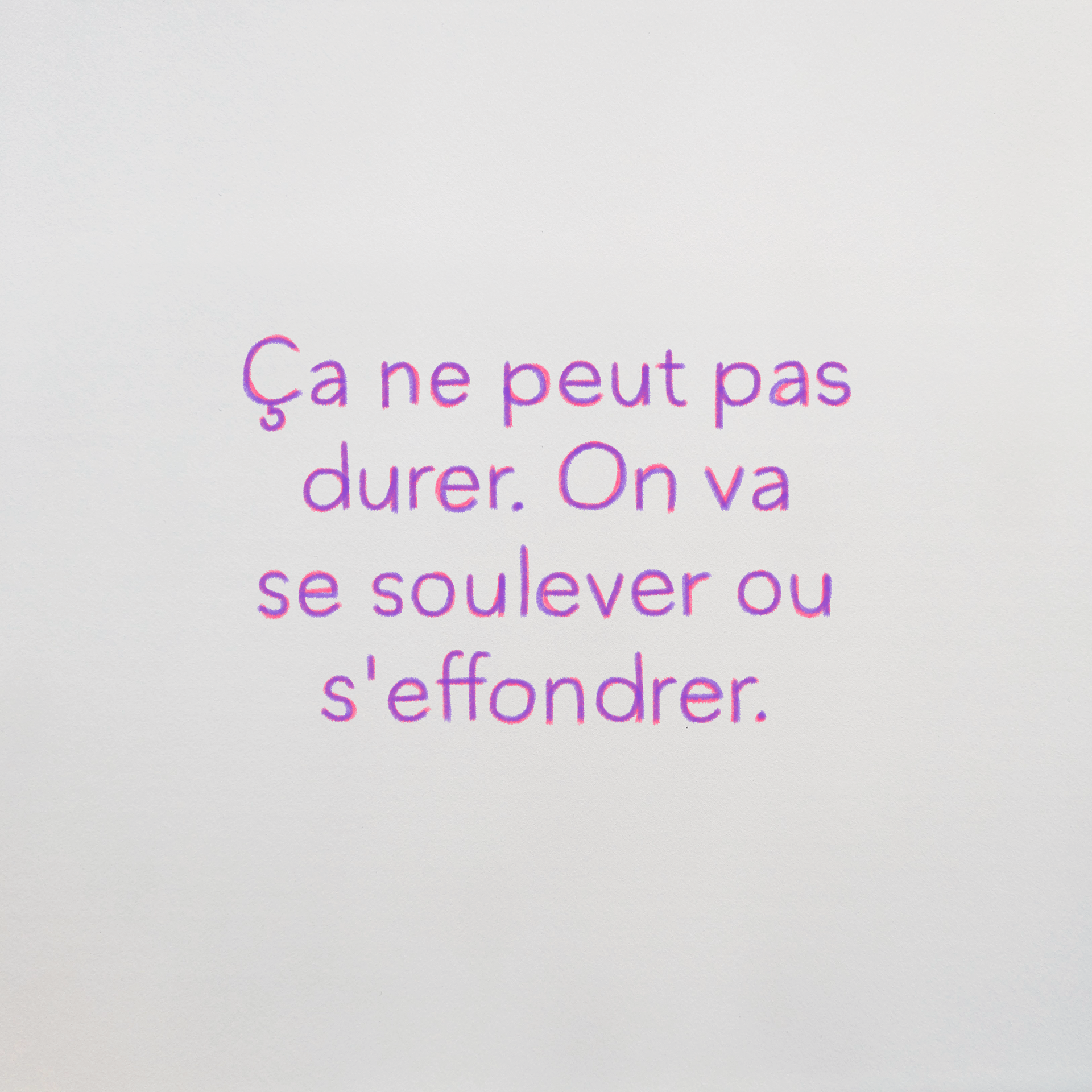 Mise en image d'un texte rédigé par un certain Pierre lors de la campagne des cahiers de doléances de 2019. Phrase simple mais assez parlante qui illustre le ras-le-bol du mépris politique, ainsi que la violence de la domination de classe. Citation découverte dans l'émission "À l'air libre" de Mediapart du 10 décembre 2024 et présente dans le film documentaire « les doléances » réalisé par Hélène Desplanques.